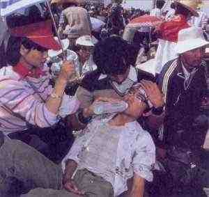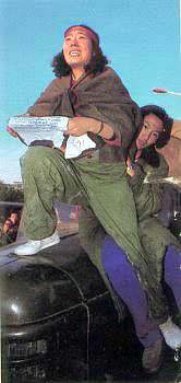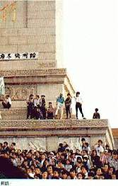 CHINESE JONESTOWNThat Chai Lin welcomed death, and that the actions of her and her hardcore followers amounted to a mass suicide, is clearly expressed by the "Supreme Commander" herself in an interview conducted in late May, just before the crackdown: "Some fellow students asked me what our plans are, what our demands will be in future. This made me feel sick at heart; I started out to tell them that what we were waiting for was actually the spilling of blood, for only when the government descends to the depths of depravity and decides to deal with us by slaughtering us, only when rivers of blood flow in the Square, will the eyes of our country's people truly be opened." [Cited in Han Minzhu, ed., Cries for Democracy: Writings and Speeches from the 1989 Chinese Democracy Movement (Princeton Univ. Press, 1990), p. 327.]