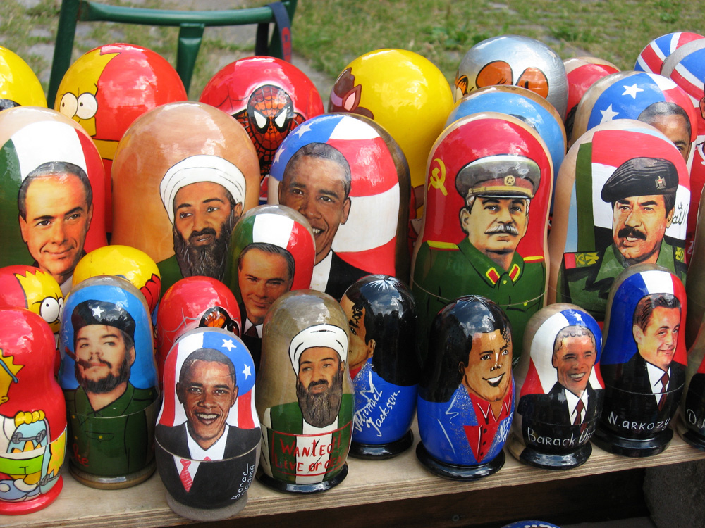 Now, I don’t think the nesting dolls vendor in Riga, Latvia, intended to make any political statement with this display (nor, really, do I), but such an arrangement in, say, an L.A. storefront would send America’s armchair semioticians into convulsions. Stalin, Saddam, Osama… the president of the United States?!? Blasphemy! (To the members of the president’s own party, anyway. And I’m sure this table included Dubya a few years ago.) And to sell tchotchkes with the likenesses of mass murderers [no, no, of course he doesn’t mean Obama and Berlusconi – Ed.]… unthinkable!