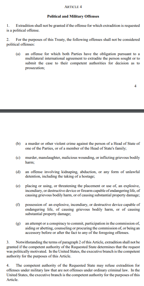 The defense have been attempting the last two days to make a rational case that this is a politically motivated prosecution and therefore not eligible under the terms of the UK/US extradition treaty of 2007 (relevant extract pictured above).