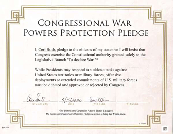 BringOurTroopsHome.US Praises Rep. Cori Bush for Signing War Powers Pledge