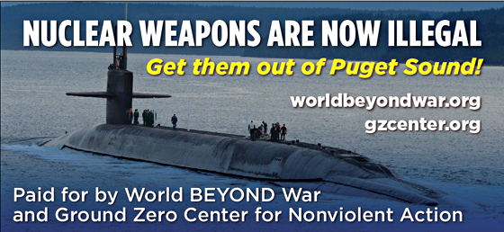 From January 18 to February 14, four large billboards are going up around Seattle that proclaim “Nuclear Weapons Are Now Illegal. Get them out of Puget Sound!”