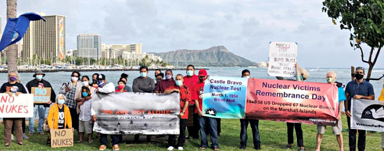 At the Honolulu commemoration, Bikinian men, women and children displayed a banner showing a large nuclear bomb mushroom cloud and reading, "We Are Not Alone." Nixon Jibas, an elected Council member representing all Bikinians exiled to Kili and Ejit Islands, read a statement from his brother, Bikini Mayor Anderson Jibas. Highlights of the statement were: