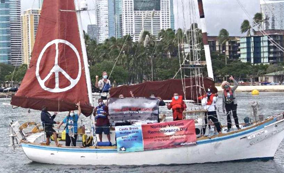 Bikinians from the Marshall Islands sail on Golden Rule peace boat to mark Nuclear Victims Remembrance Day