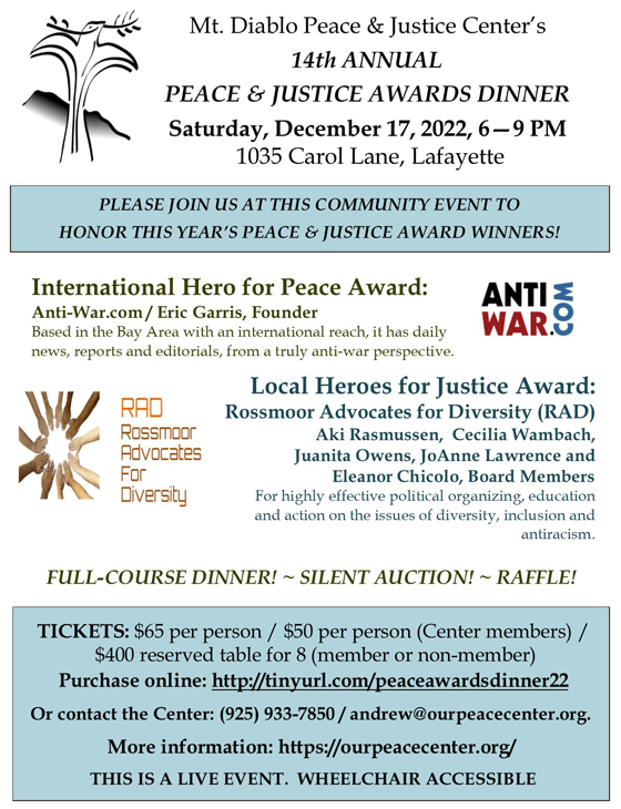 Tickets: $65 per person / $50 per person (Mt. Diablo Peace & Justice Center members)