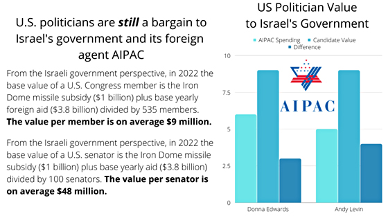 In 2021-2022 AIPAC launched a new PAC and super PAC to promote Israel’s preferred candidates over those who might instead demand abidance to American popular demands, international law, peace, justice and fairness. For the most part in 2022, Israel’s foreign agent managed to install pliable politicians and keep more principled representatives out of power.