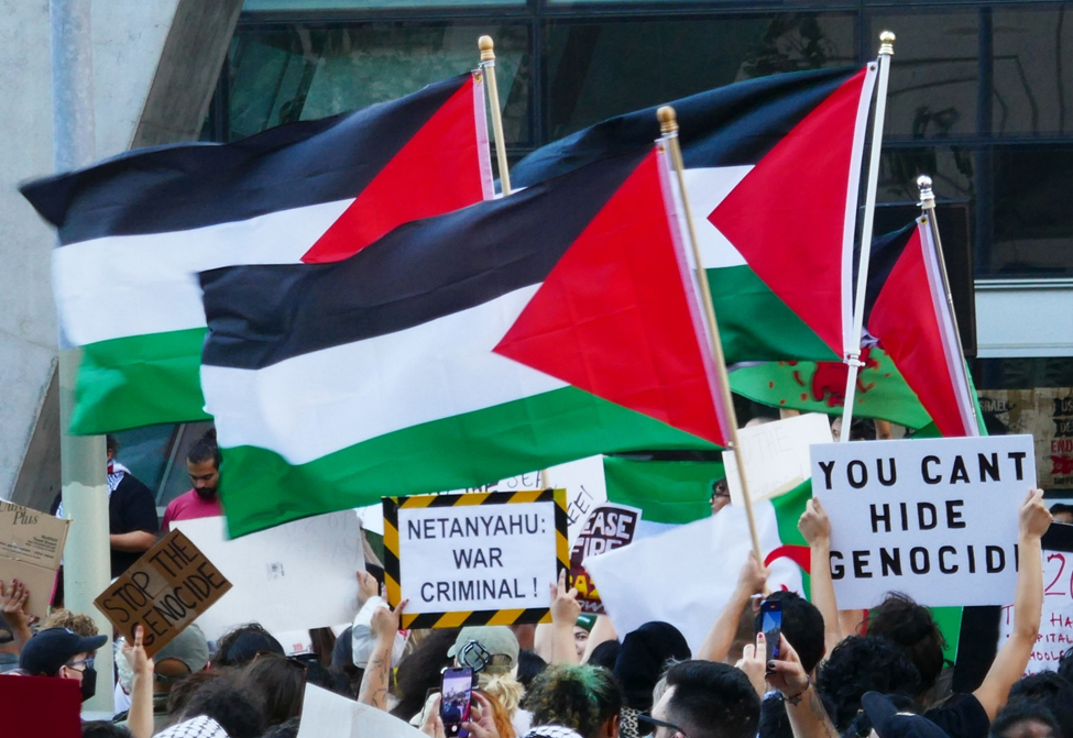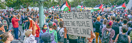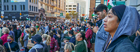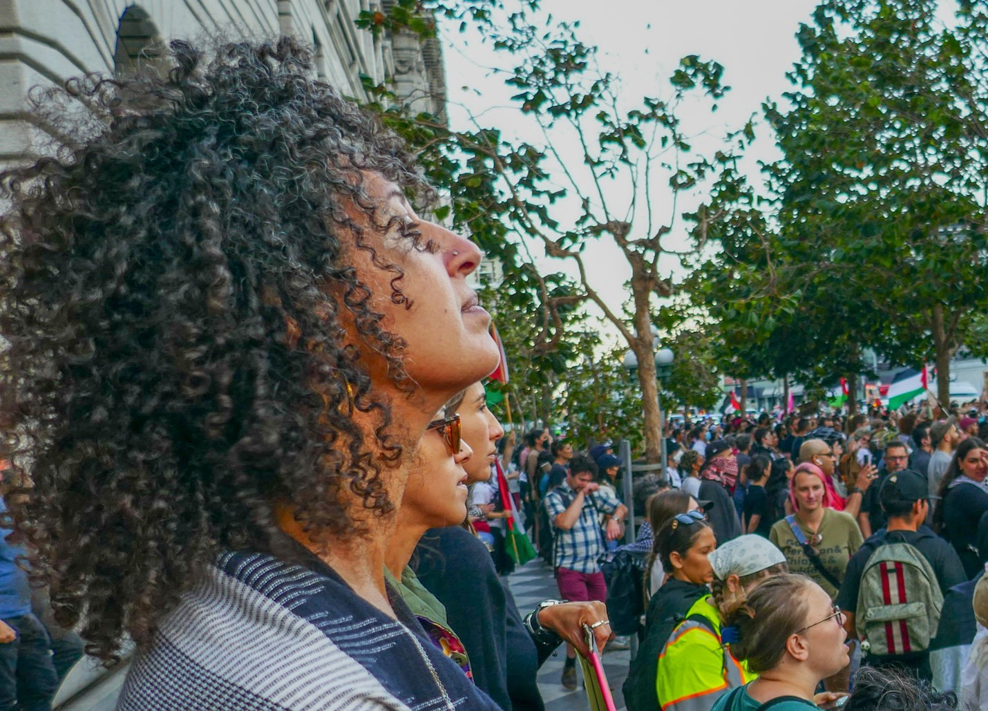 As people got off work on Thursday evening, October 19, the street in front of the Federal Building in San Francisco swelled with a spirited crowd chanting, “From the river to the sea, Palestine will be free.” An ocean of demonstrators stopped traffic as Homeland Security police looked on and a helicopter hovered overhead.