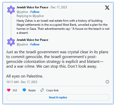 The ad depicts an artist’s rendering of luxury homes superimposed over an actual photograph of a Gaza neighborhood destroyed by Israeli attacks – which have killed nearly 20,000 people while displacing over 85% of the embattled strip’s 2.3 million people since early October.