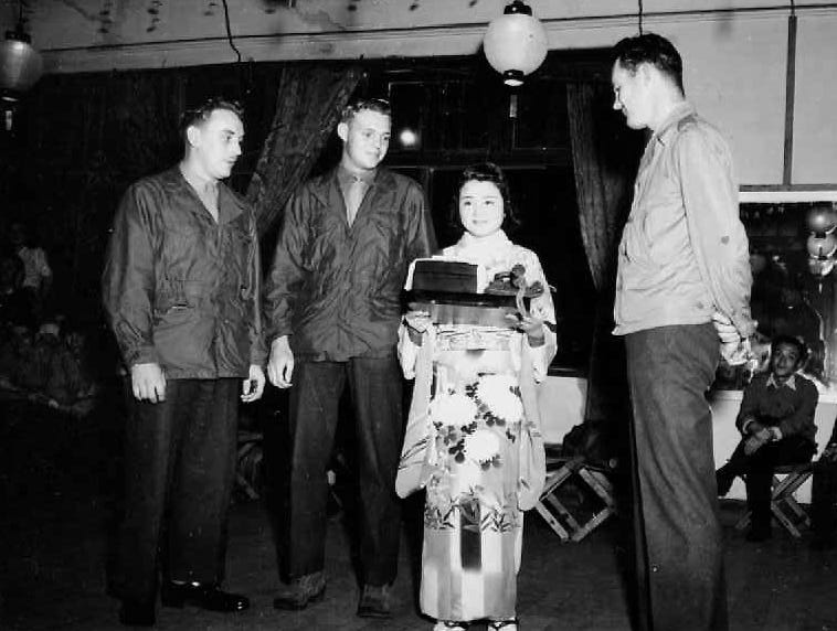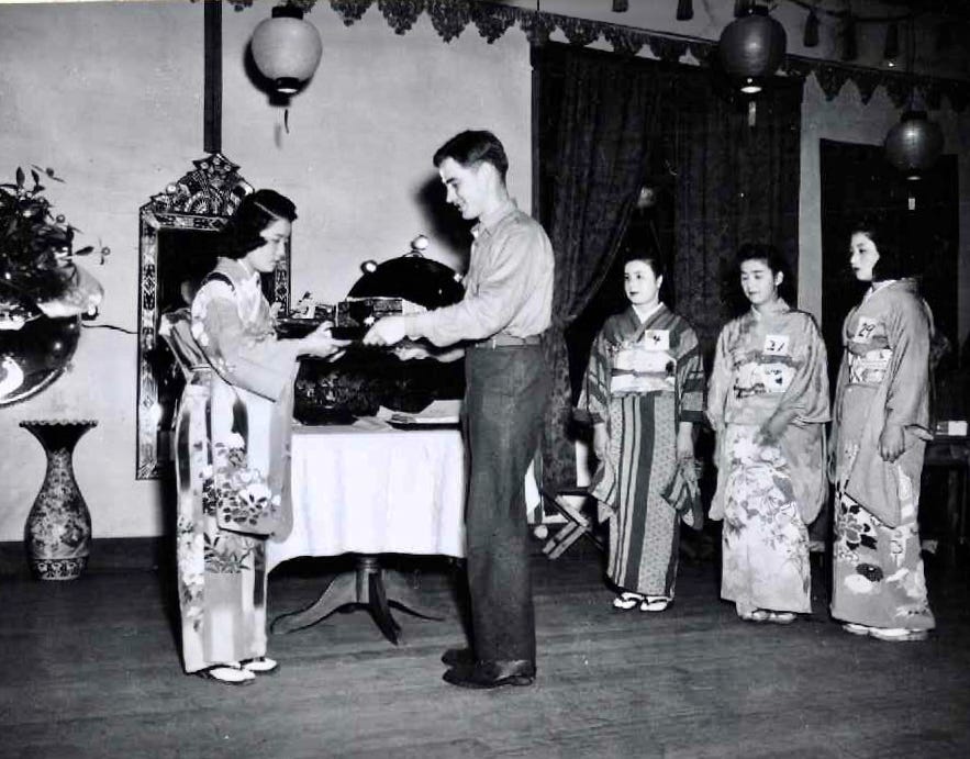 Three U.S. Marines were among the ten judges in a competition that somehow took three days to complete (April 29-May 1). It was staged in a dance hall in the southern part of the city, well outside the zone of worst destruction. (Remember, the bomb exploded more than a mile off target, so “only” half the city was wiped out.) The hall had become slightly notorious as it was a prime site for occupying troops to pay money to dance with and maybe woo local women.