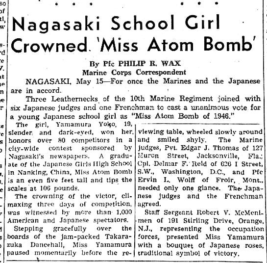 By the summer of 1946, most of the Marine occupiers of Nagasaki had been sent home. Before departing, some helped promote and/or served as judges for a Miss Nagasaki beauty pageant, which they took to calling the “Miss Atom Bomb” contest. The contestants, whose ages ranged from 17 to 25, were young Japanese women, surely some of them widows or daughters of men killed in the Pacific war or in the atomic bombing. They had entered by responding to ads in the three leading local newspapers calling for young women who symbolized “Nagasaki rising from the ruins.”