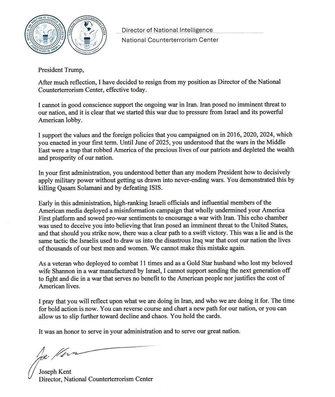 Addendum: Perhaps I should add that I don’t agree with everything in Kent’s resignation letter, nor would I be likely to vote for him, assuming he runs for office again. His resignation letter is useful exactly because he was a strong Trump loyalist whose military record earns him respect among those who are otherwise unlikely to question Trump and the official narrative. In short, for me this isn’t about Kent and his character, It’s about his recognition that there wasn’t an imminent threat from Iran and his willingness to highlight the roles played by Israel and AIPAC in U.S. politics and foreign policy. As a Trump insider, his words carry persuasive weight. They could also indicate a fracturing of support for Trump’s disastrous war with Iran.
